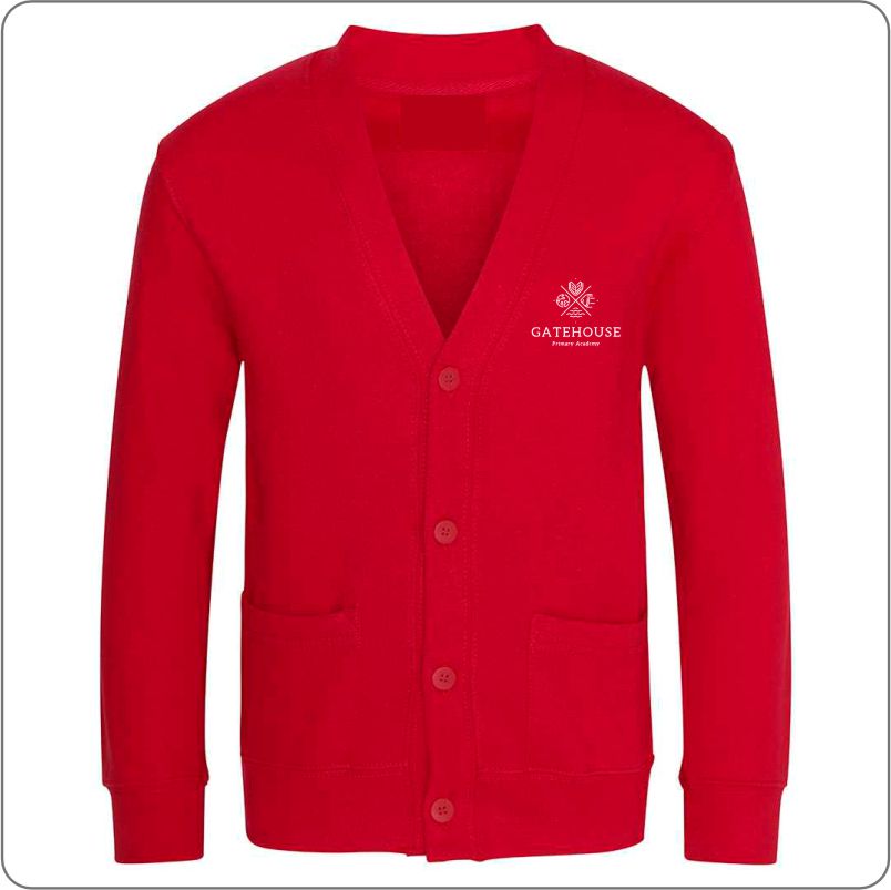 The Gatehouse Primary School Cardigan comes in red complete with the school logo embroidered on the breast.